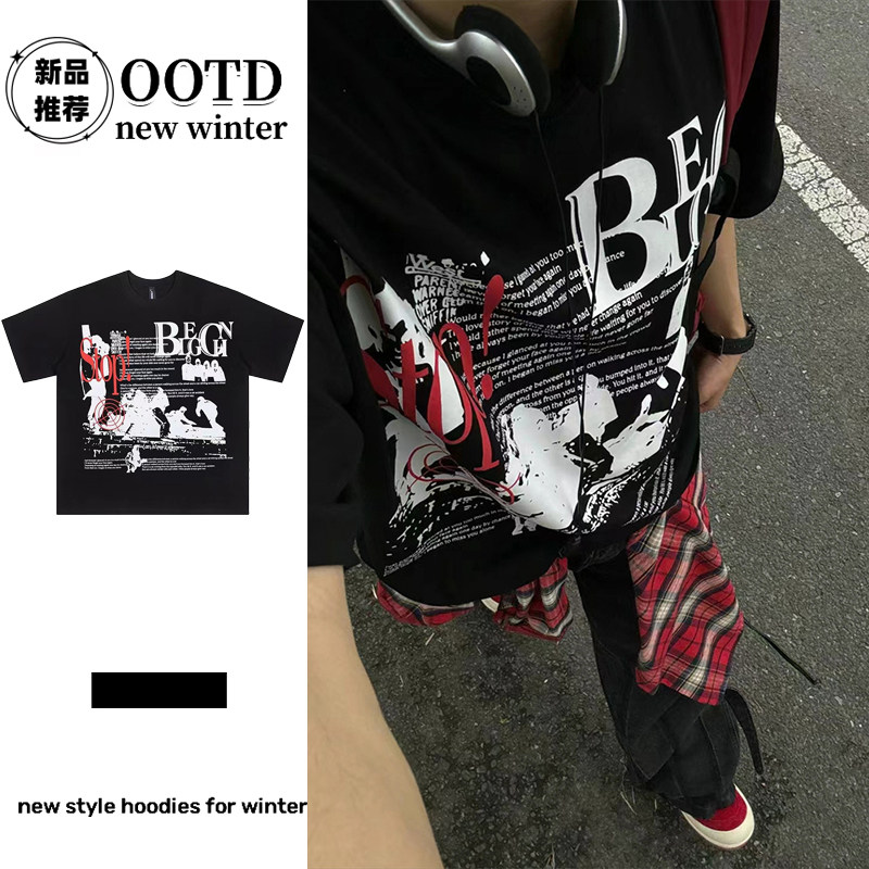 纯棉短袖男款美式高街t恤男黑色高级感痞帅百搭休闲情侣半袖上衣