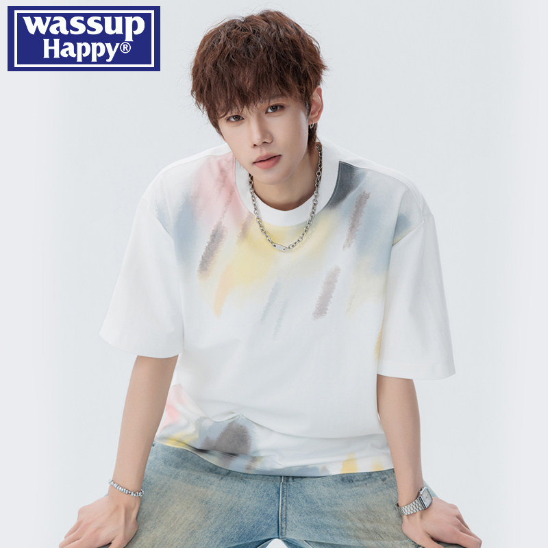 wassup happy美式渐变圆领短袖t恤男士夏季宽松潮流百搭半袖体恤