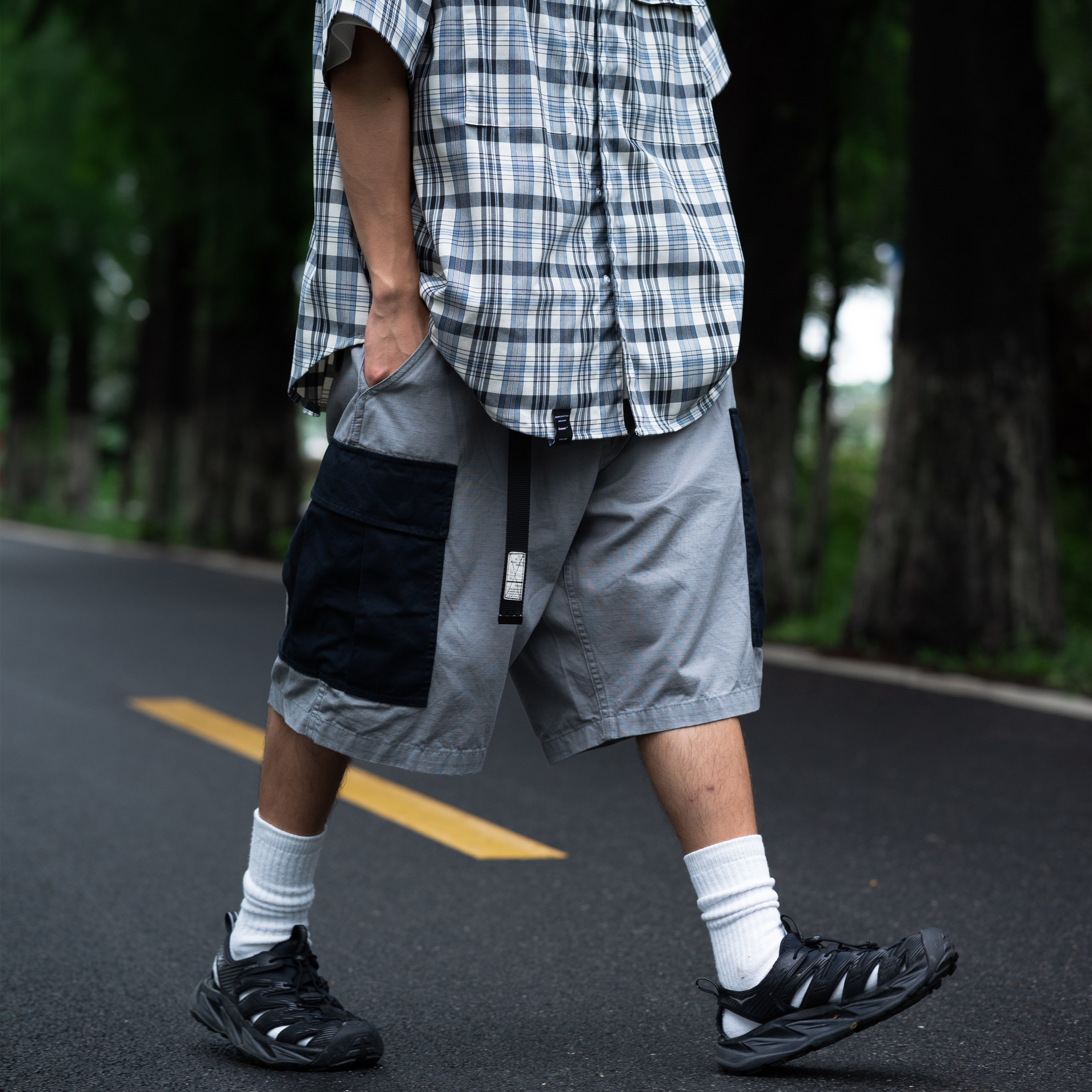 淘宝Gnomes lab 22SS 紧密纺灰绿抗撕裂格子布工装短裤 日系复古国潮