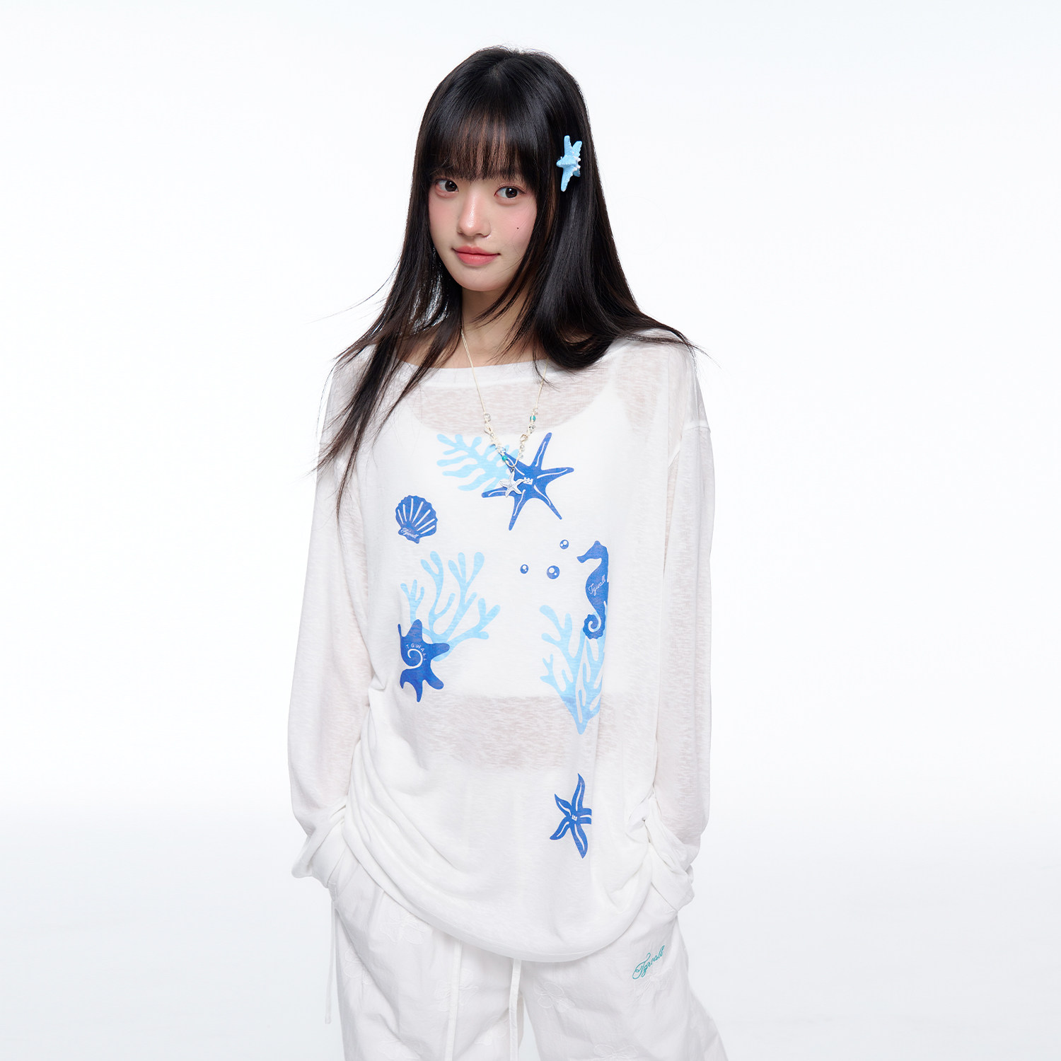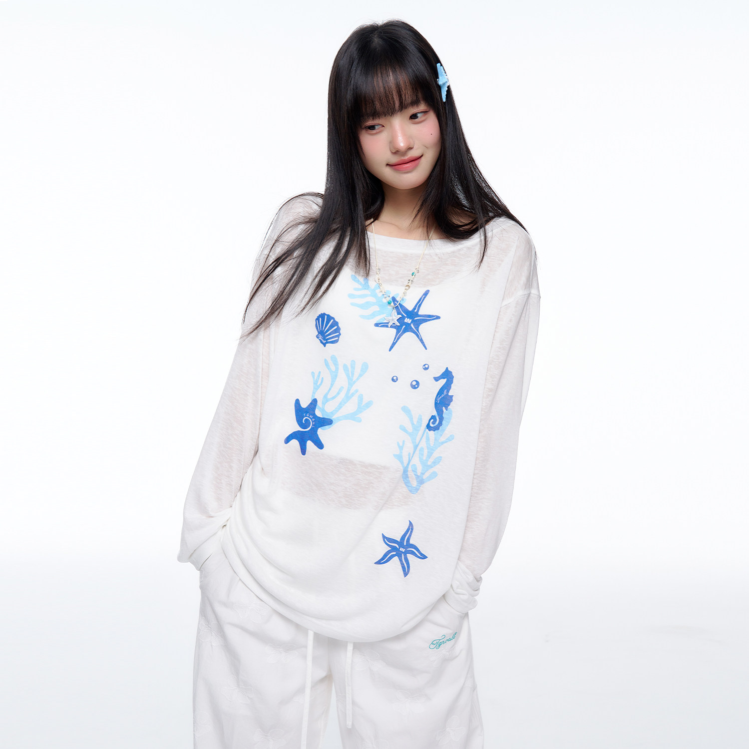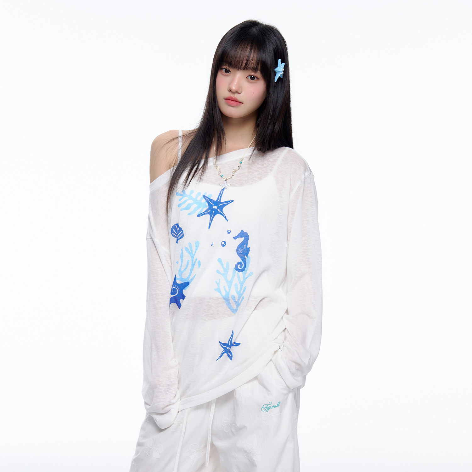TGWALL「蓝汐」海洋印花春夏薄款微透慵懒感斜肩罩衫长袖T恤上衣