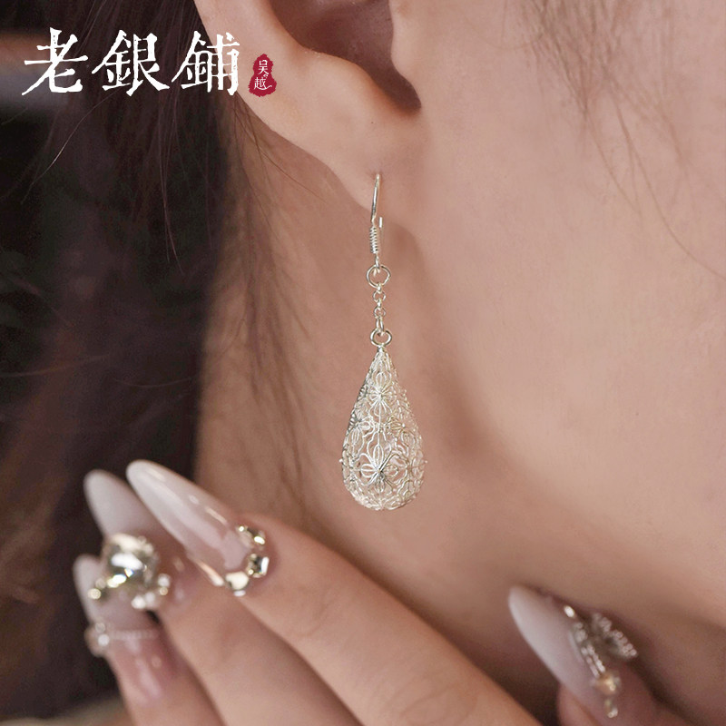吴越老银铺足银玲珑滴耳环时尚百搭纯银耳环耳钉水滴耳饰送朋友