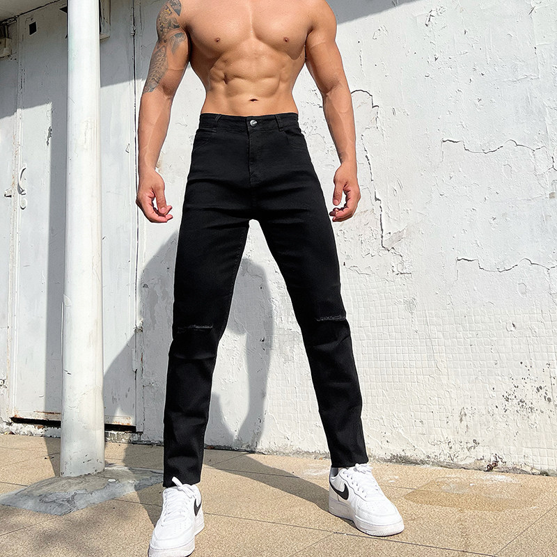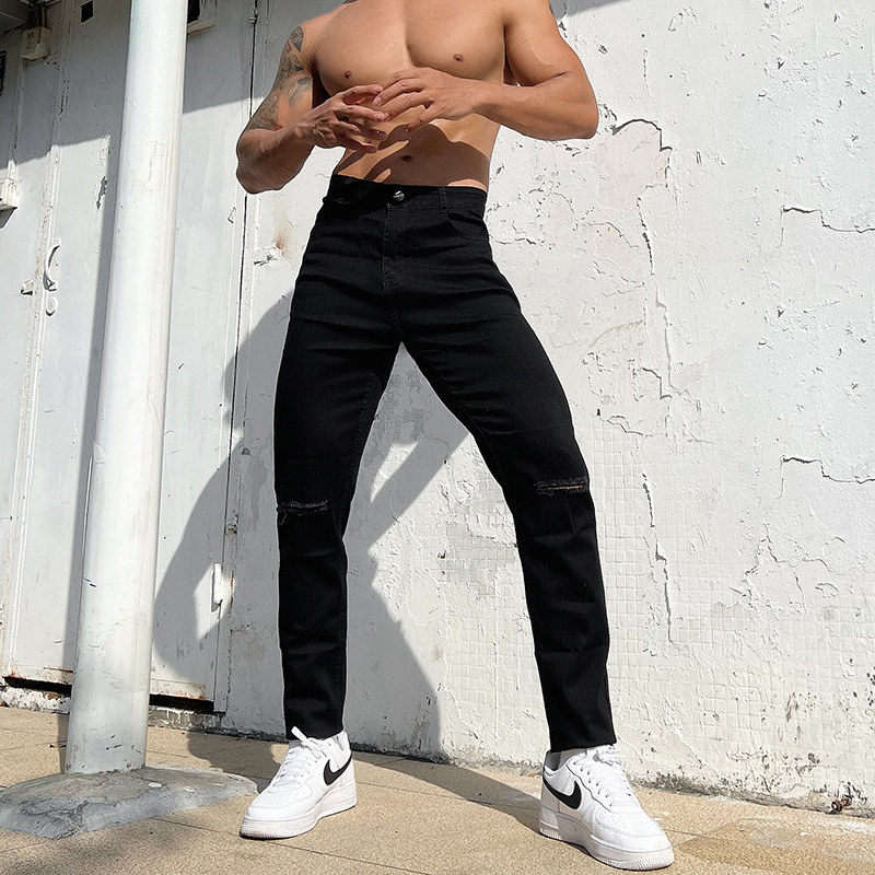 辉先生秋冬季男士纯色膝盖割破牛仔裤中腰休闲直筒修身弹力长裤