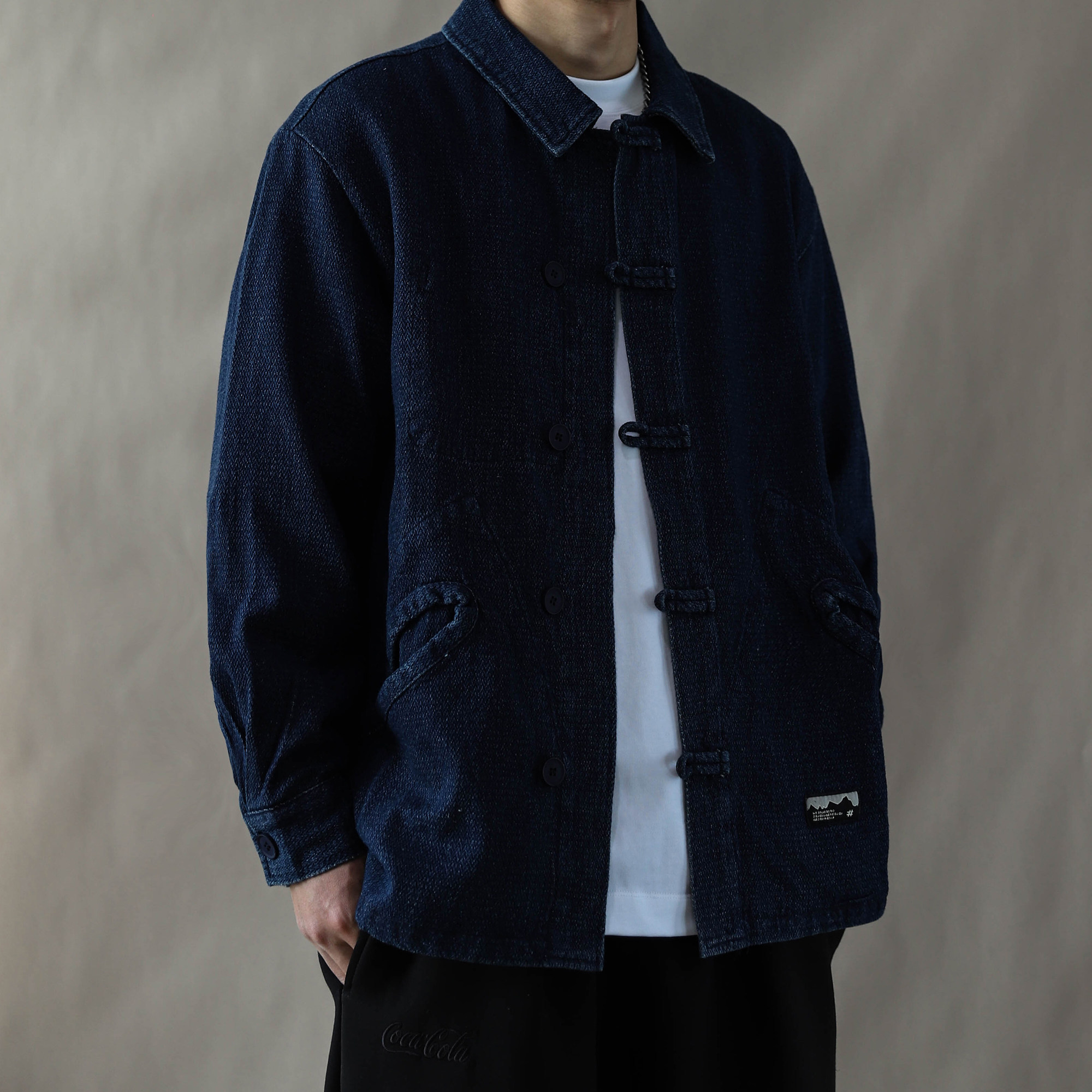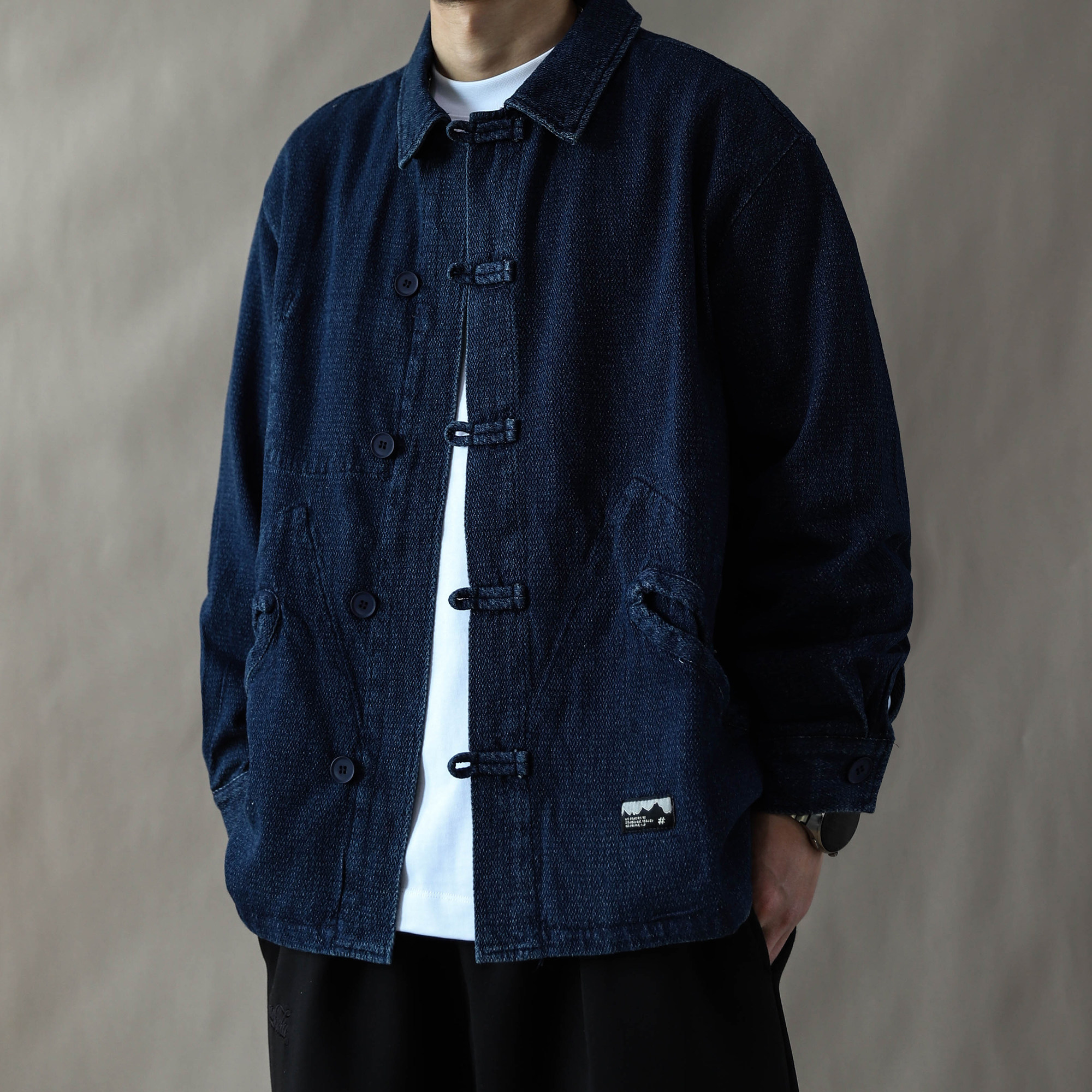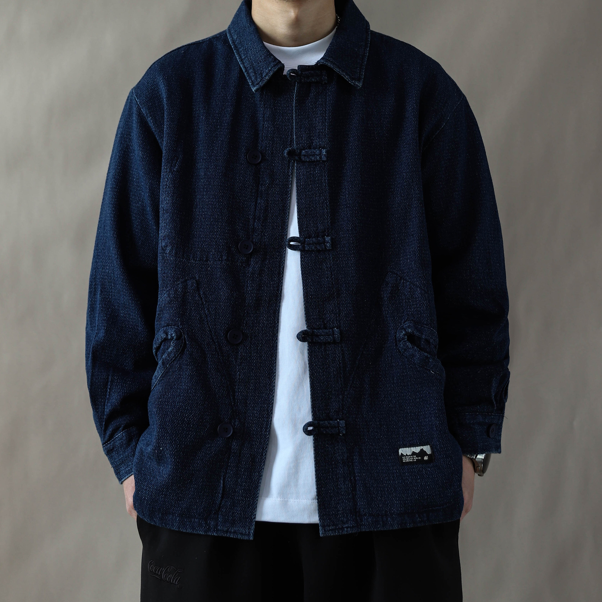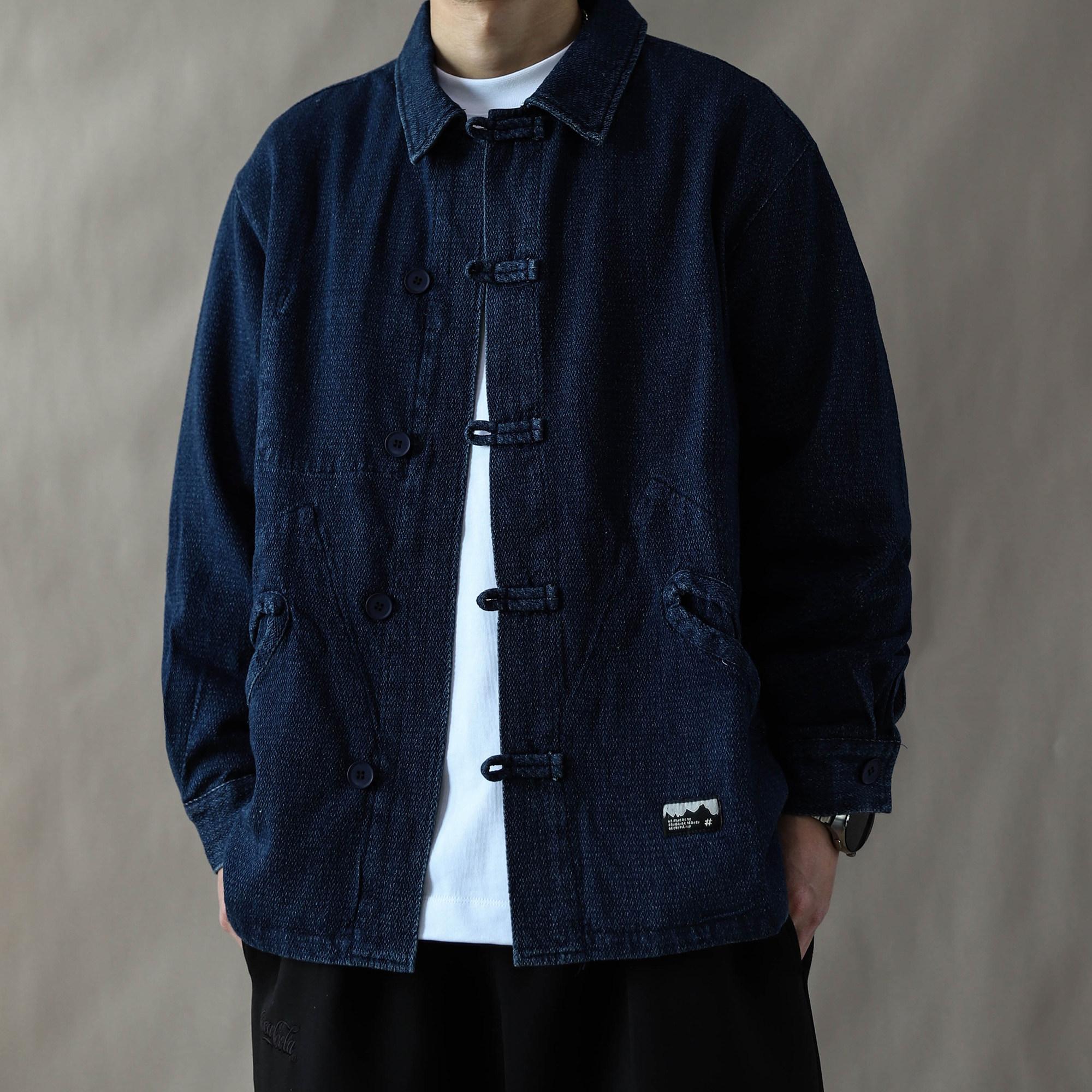--------------------- 中国风复古风翻领盘扣水洗牛仔夹克男春秋宽松国潮外套道袍蓝色 【原售价】499元 【现售价】218元 【推荐理由】