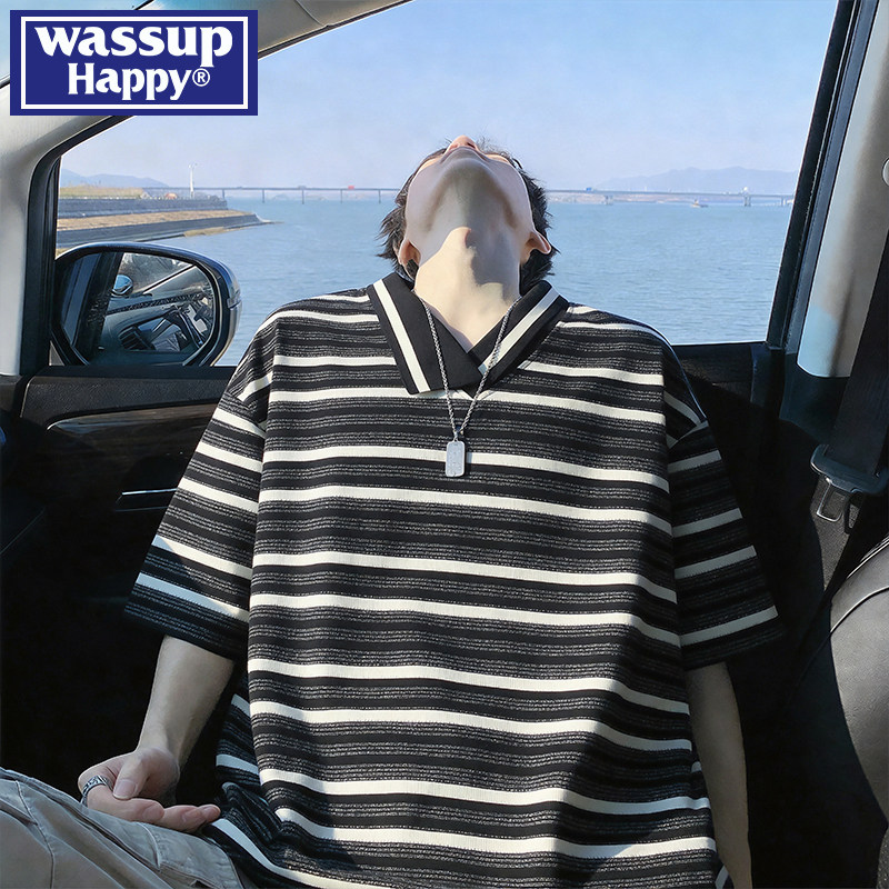 wassup happy不规则领口条纹短袖polo衫男夏季新款设计感宽松半袖