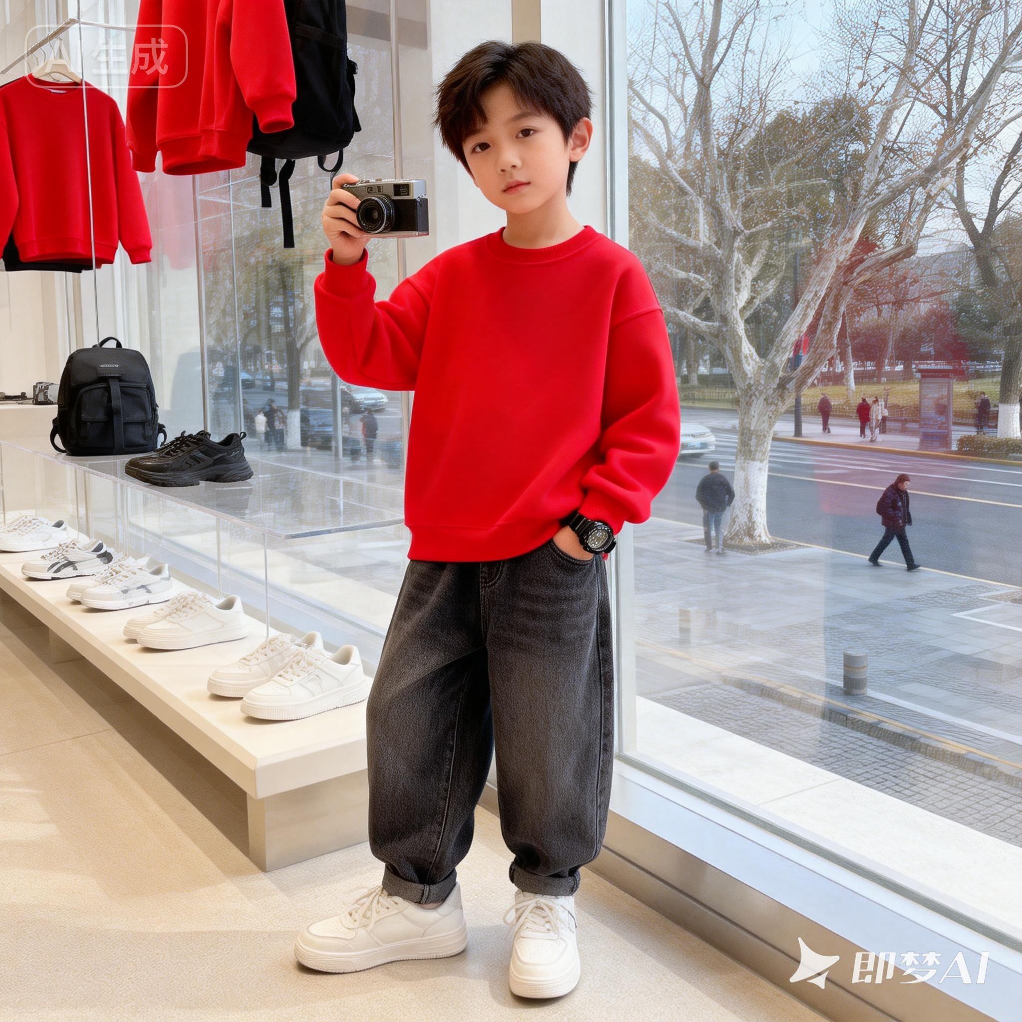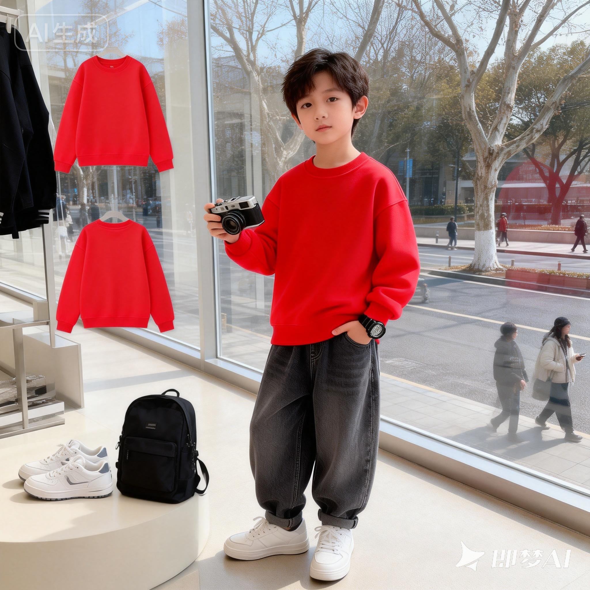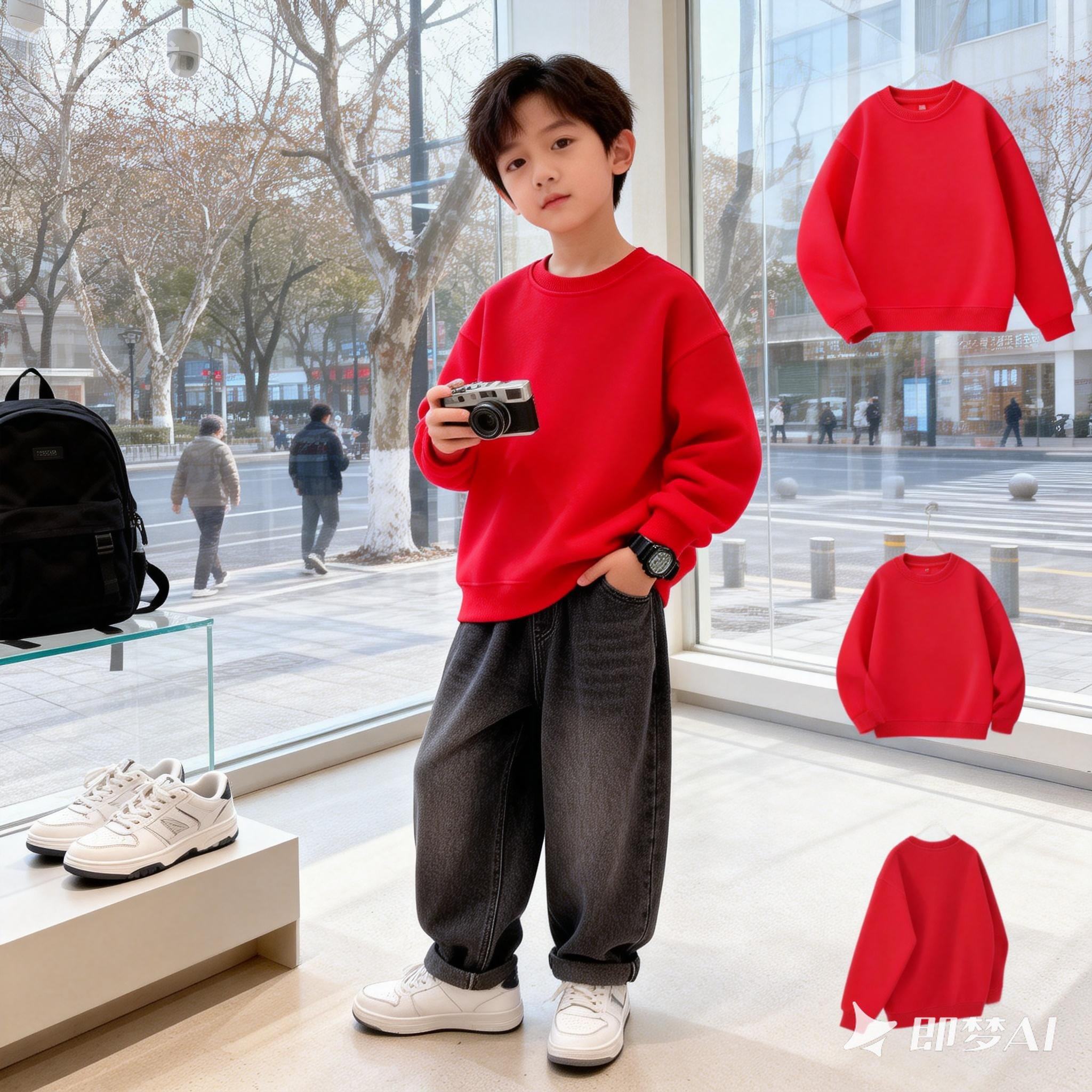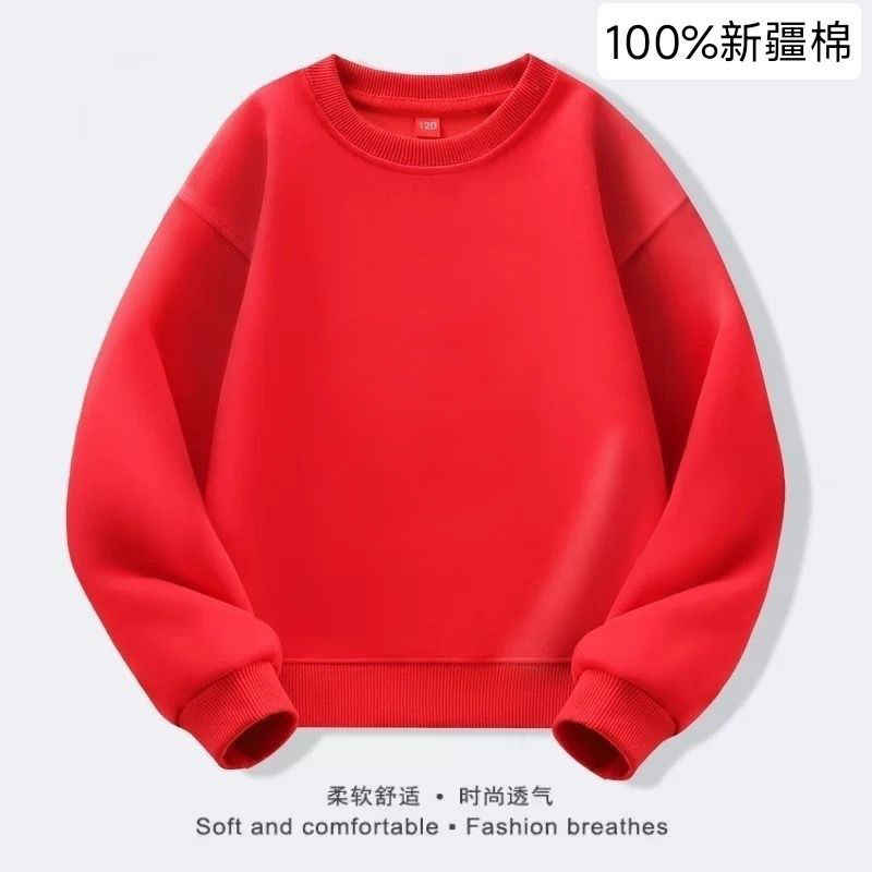 淘宝研棉世家儿童红色圆领卫衣男童加绒套头衫长袖宽松亲子装秋冬上衣