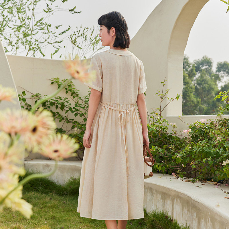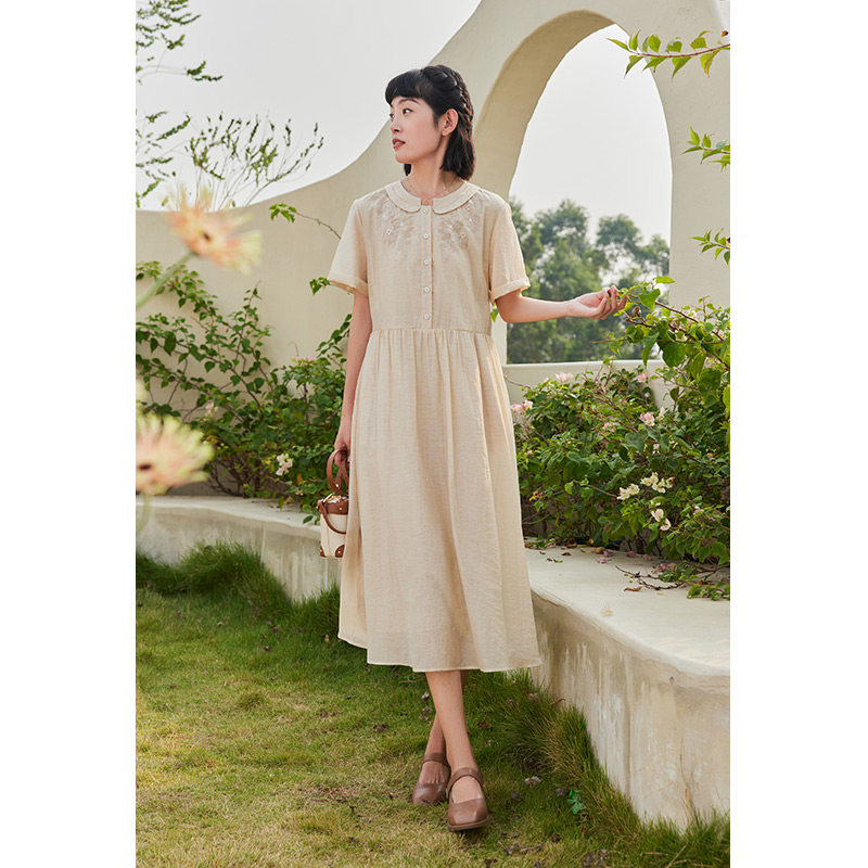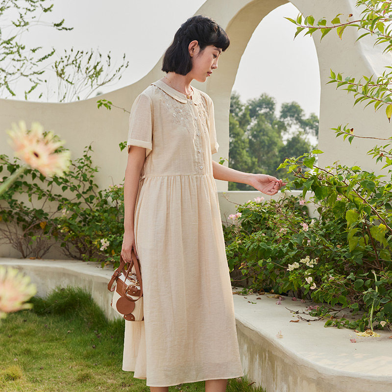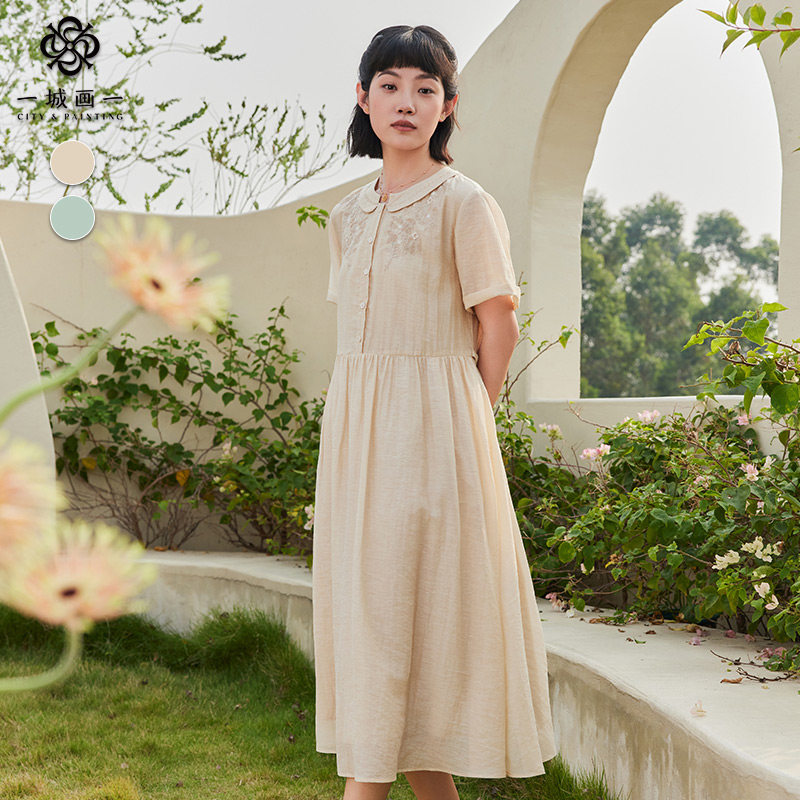 一城画一夏季文艺范纯色刺绣提花中款连衣裙轻薄柔软天丝长裙