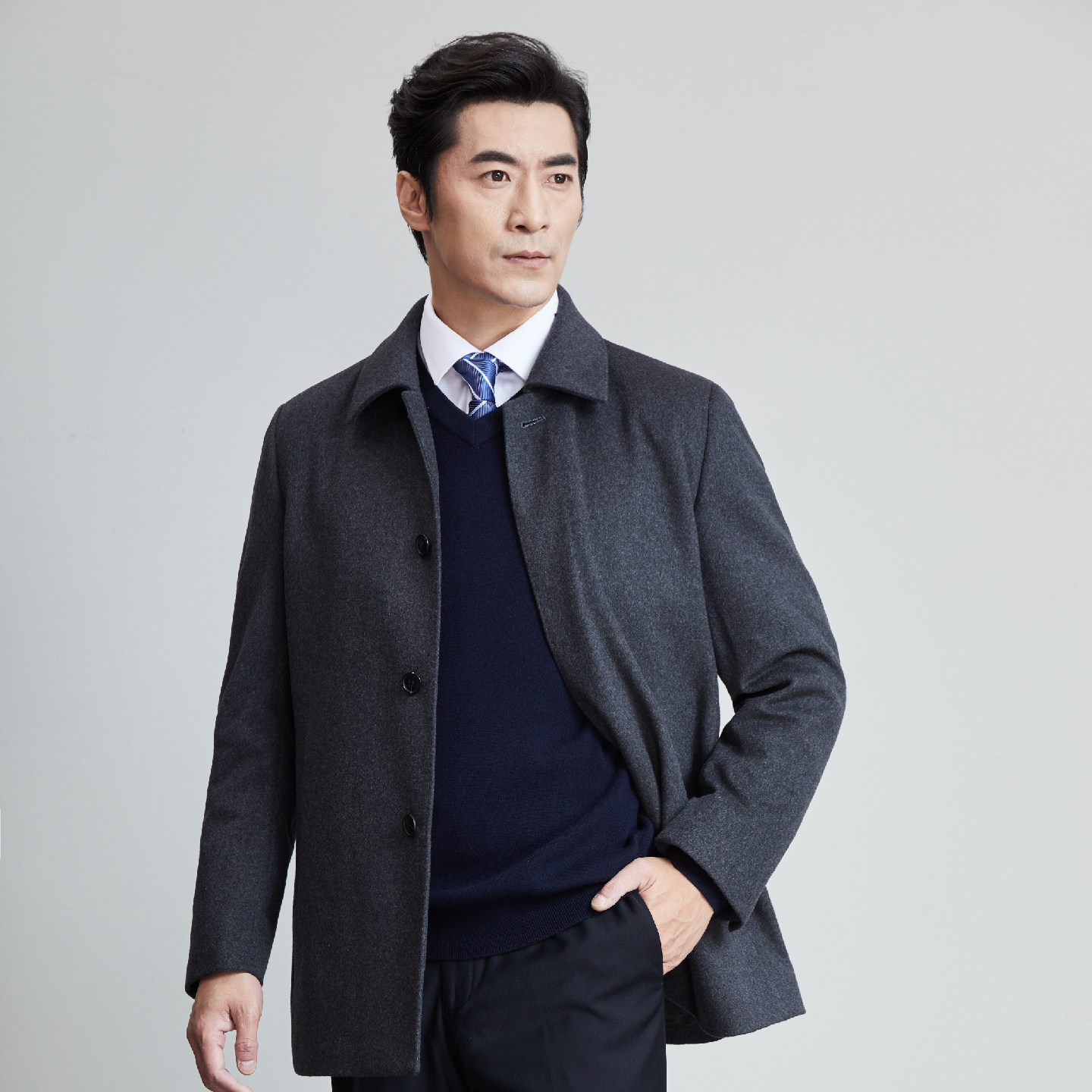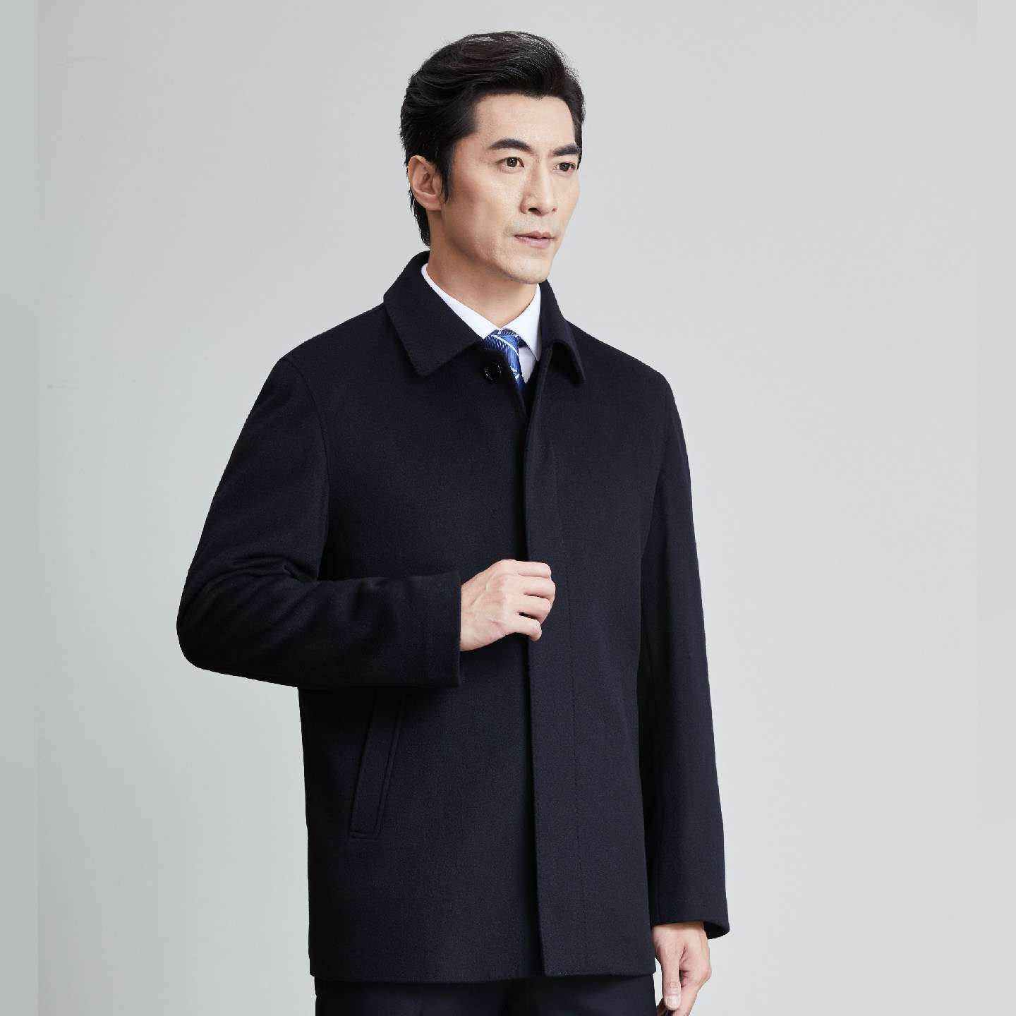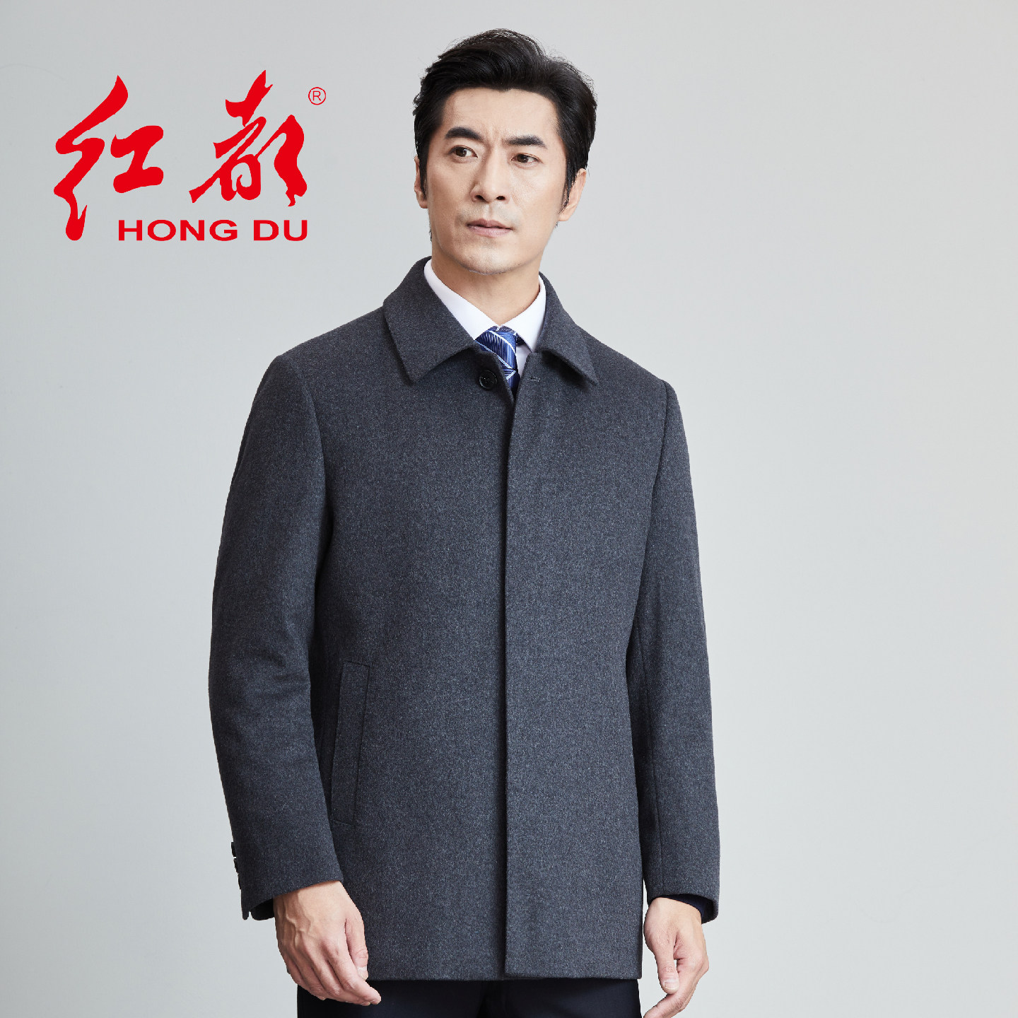 红都男士毛呢大衣短款中老年翻领上班系扣羊毛呢子男外套