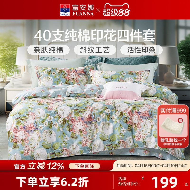 --------------------- 富安娜床上用品四件套全棉纯棉100套件春夏床单印花被套床笠被罩 --------------------- --------------------- 【原价】1780元 【券后价】188元