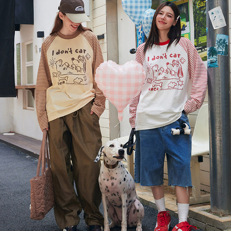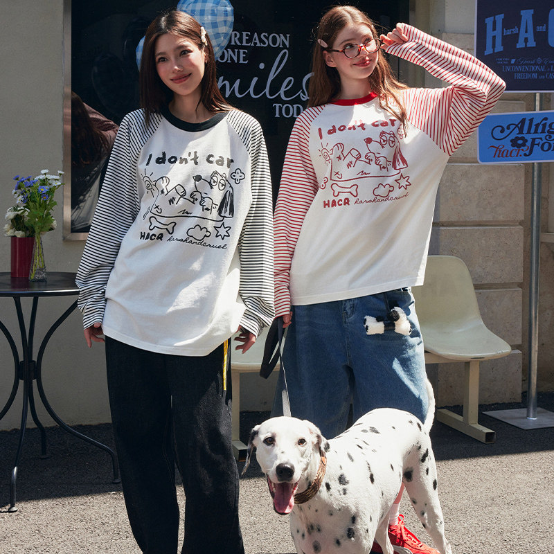 HACR丨harshandcruel韩系条纹拼接手绘慵懒情侣宽松插肩袖长袖T恤