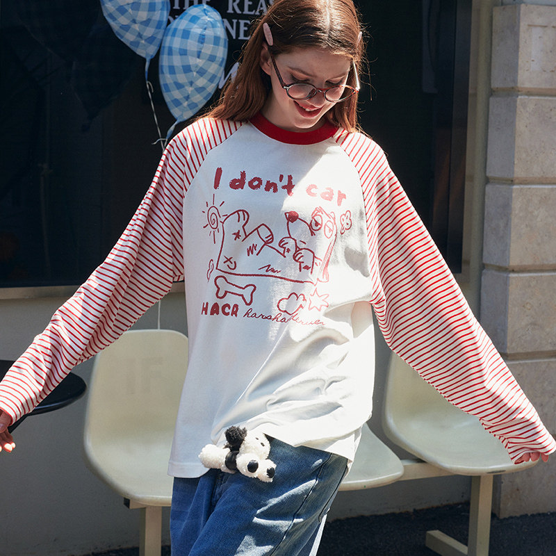 --------------------- HACR丨harshandcruel韩系条纹拼接手绘慵懒情侣宽松插肩袖长袖T恤 【原售价】199元 【现售价】87.1元 【推荐理由】