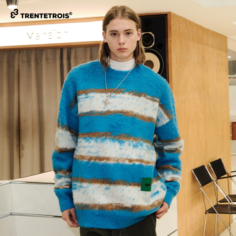 33TRENTETROIS潮牌条纹毛衫刷毛工艺设计潮流个性复古条纹针织衫