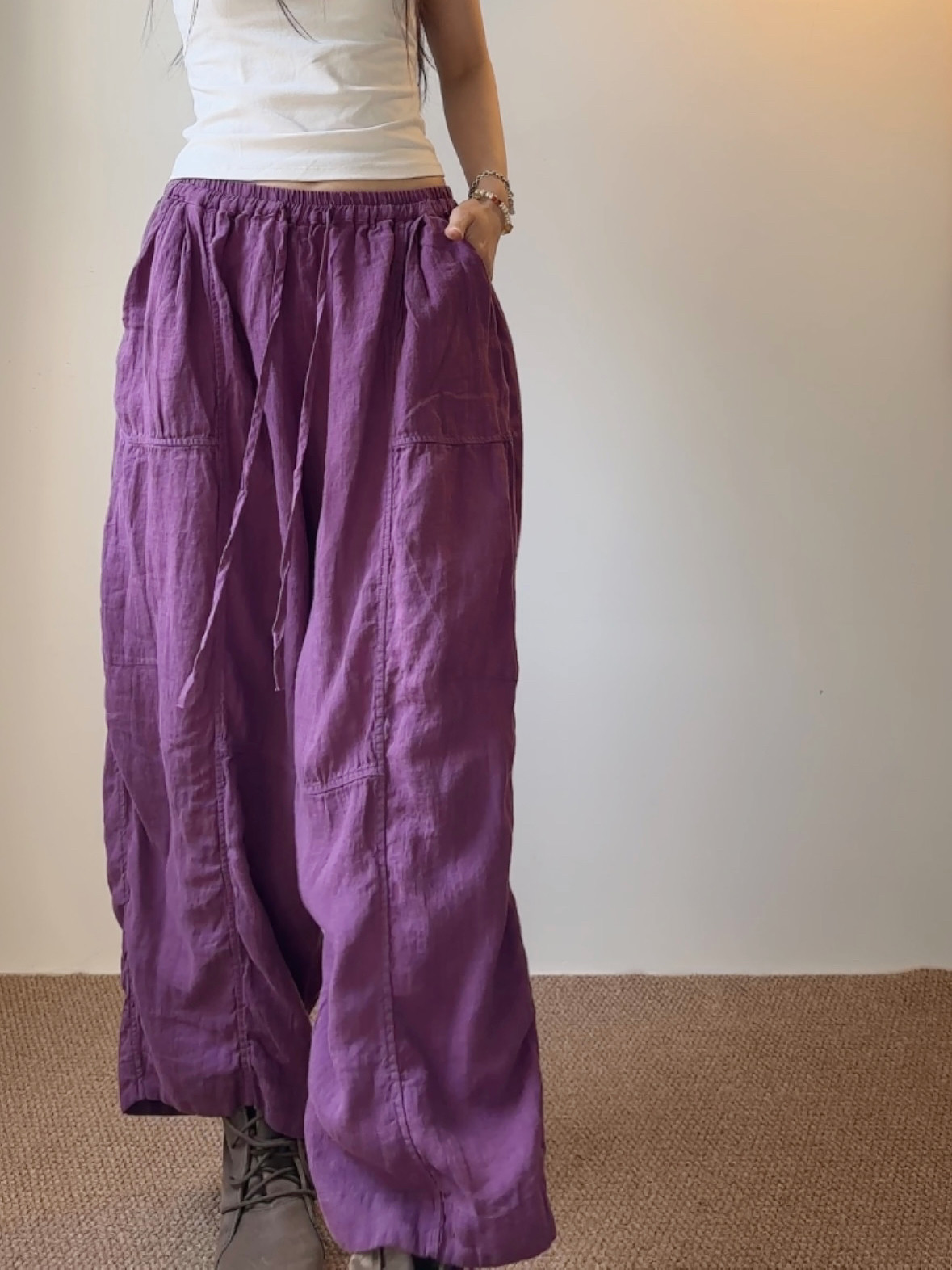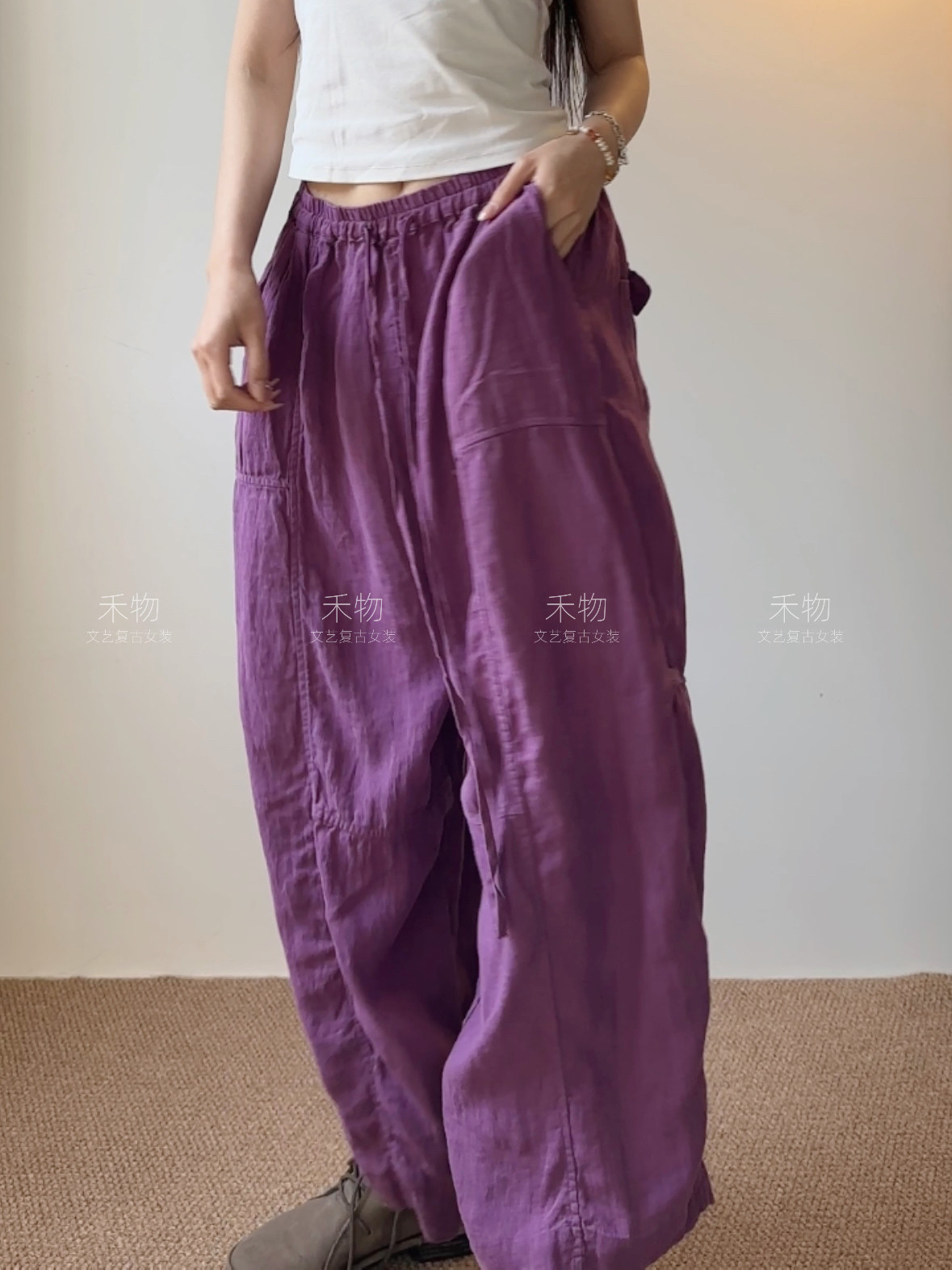 文艺亚麻拼接个性阔腿裤松紧腰宽松垂感休闲裤子透气凉感吸汗长裤