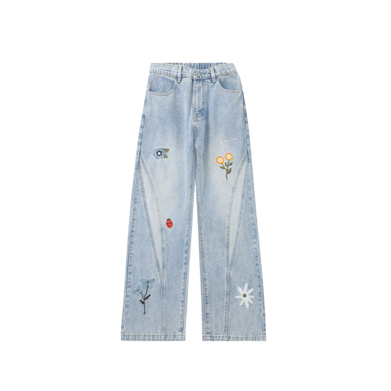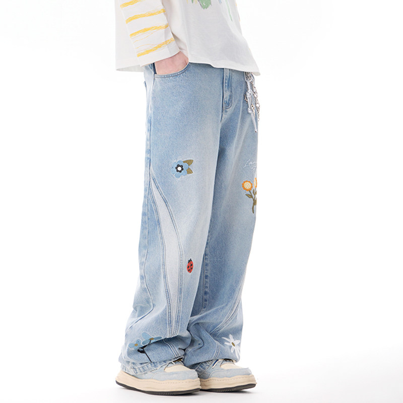 周深同款LAMLICKA花朵刺绣蓝色牛仔裤阔腿宽松拼接休闲百搭直筒裤