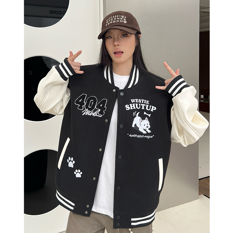 404MOB可爱毛绒小狗刺绣2025棒球服外套男女美式宽松学院设计夹克
