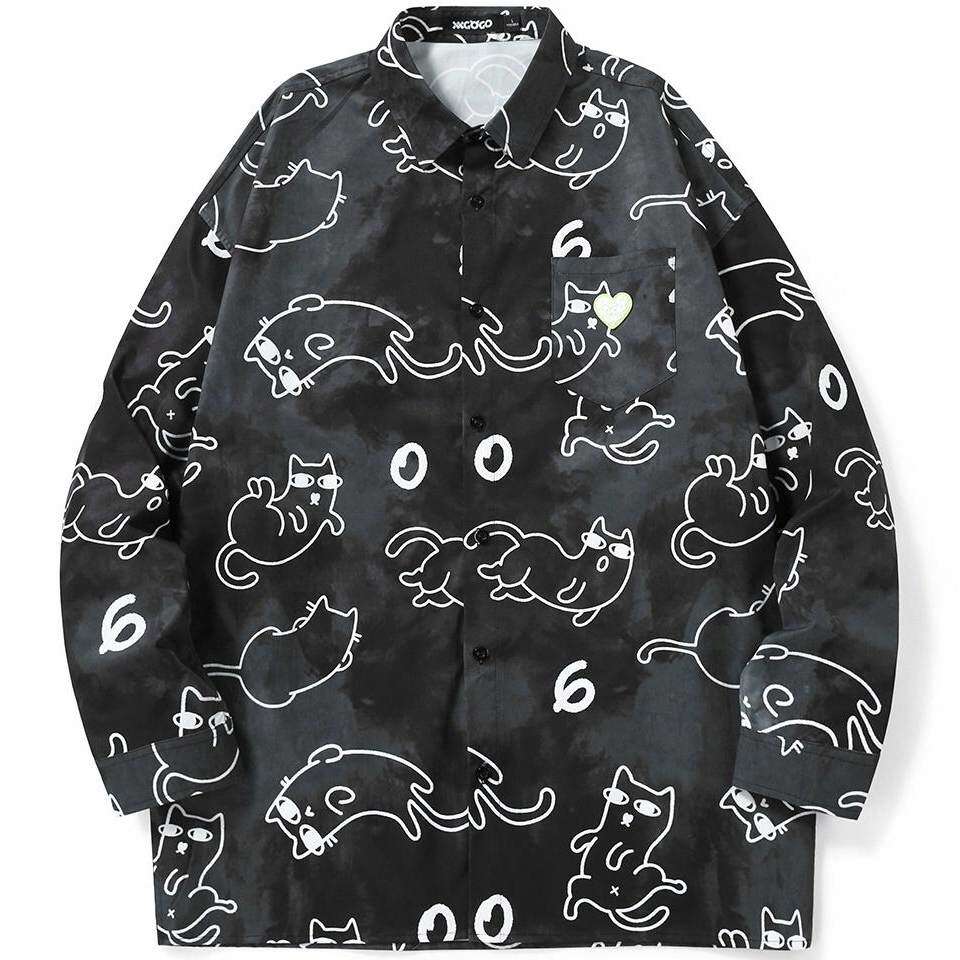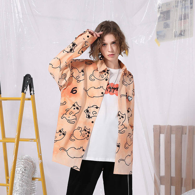 XXGOGO春秋季卡通猫咪满印晕染长袖衬衫男女同款宽松衬衣情侣装