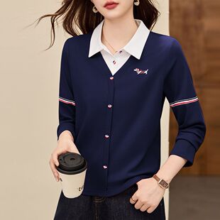 翻领长袖t恤女2025新款早秋爆款女装假两件上衣时尚洋气薄打底衫