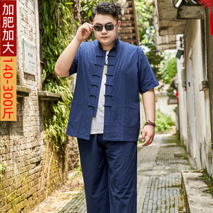 大码男装短袖套装中国风唐装加肥加大宽松衬衫薄款立领休闲两件套