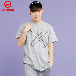 DEVIL NUT恶魔潮牌情侣短袖T恤灰色印花圆领纯棉宽松上衣